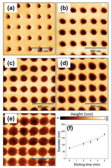 Atomic force microscopy (AFM) images of fabricated polyacrylonitrile PAN nanohole structures with etching times of (a) 0, (b) 2, (c) 3, (d) 4, and (e) 5 min. (f) Nanohole diameters as a function of etching time. The red line corresponds to a linear fit of the data [91].