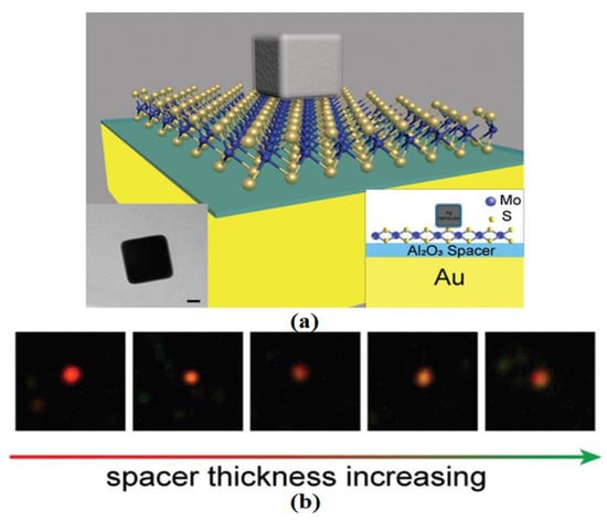 (a) 3D illustration of NCoM cavity encapsulating monolayer MoS2 flakes. (b) Tunability of plasmonic cavity resonance in NCoM systems [97].