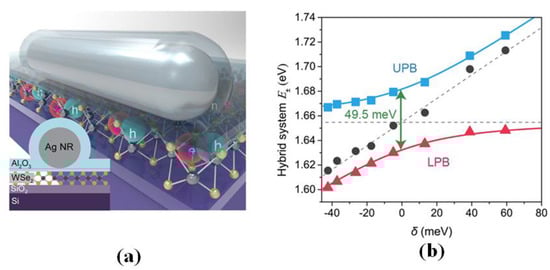 (a) Schematic of system with a single silver nanorod on a WSe2 monolayer. (b) Energies of the upper plexciton branch (UPB) (E+, blue square) and the lower plexciton branch(LPB) (E−, magenta triangle) as a function of the detuning [102].