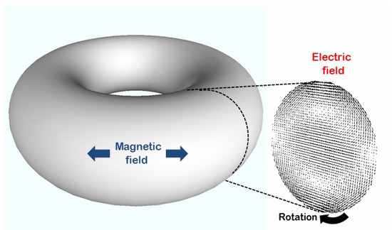 Electromagnetic fields circulating in a toroid cavity . The electric field lies on each vertical section, whereas the magnetic one is distributed parallel to the large circumference. The time evolution recalls that of a fluid dynamics vortex ring.