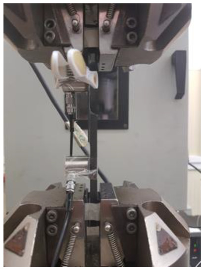 The tension was applied to the specimens under displacement-controlled mode at a speed of 13 mm/min, in accordance with the ASTM D5868 standard and previous works presented in the literature [27,28]. Although the value of the strain rate suggested from the standard method is quite high, it does not significantly influence the mechanical response of the lap joints [29]. The test was carried out in the INSTRON servo-hydraulic testing machine with a maximum load capacity of 100 kN. To record the acoustic activities under loading, two narrow-band general purpose AE sensors were used: R30a (Physical Acoustics, MISTRAS Group, NJ, USA). The sensor has an operating range of 150 kHz to 400 kHz and a resonant frequency of 300 kHz. The reason for selecting the narrow band sensor is because in CFRPs, the recorded AE signals mostly are under the frequency band of 400 kHz. To avoid unnecessary noise, the narrow-band sensor was selected. For the same purpose, the sampling rate was set as 1 MSPS (mega samples per second). The threshold of AE acquisition was set at 35 dB and the recorded signals were amplified by 40 dB through a 2/4/6 AE (Acoustic Emission) preamplifier.