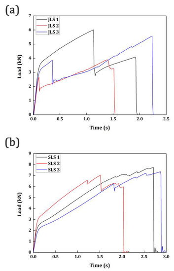 Load vs. time curve: (a) JLS Specimens; (b) SLS Specimens.