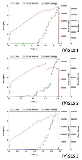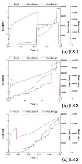 While looking at Figure 6, all the three specimens have almost similar patterns in terms of load vs. time, cumulative counts and energy. However, the simultaneous increase in the counts and energy of the SLS specimens must not be compared or to be confused with the JLS specimens. Although in both the cases the cumulative counts and cumulative energy increased linearly, the slope of the increment is entirely different. The slope of the increment in SLS specimens is higher than the JLS specimens. Therefore, they do not represent the same damage mode although it looks similar. In the SLS specimens, the cumulative counts and energy are very low during the initial stages of loading until the specimens have suffered their initial rupture. In the SLS specimens, most of the load is distributed in shearing and these low-energy and low-count AE signals indicate the shearing occurring in the adhesive region. AE signals connecting to fiber breakages and transverse cracks growth release acoustic data with higher energy and lower counts, owing to their lower order symmetric nature. Since the energy and counts recorded are low during these stages, these signals are higher order asymmetric in nature that could be connected only to shearing phenomena [20]. Beyond the region of the initial rupture, in all three SLS specimens, the cumulative counts and energy start to increase simultaneously until they reach the final failure. This indicates that the cumulative counts and energy were very low until the crack opens in the adhesive. Generally, the crack openFs at the adhesive and adherend interface, which is governed by the geometry of the overlapping area. Once the crack had opened, due to the brittle nature of the adhesive, it progressed faster through the thickness of the adhesive. This interlaminar crack growth always generates higher counts and higher energy. This pattern continued until the specimens failed at the final rupture.