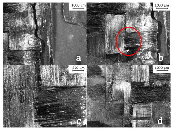 Similarly, the optical images of SLS specimens are presented in Figure 8. Figure 8a shows the complete lack of matrix/fiber debonding in the area where the adhesive is applied. The fibers are left unharmed in the fractured region of the adhesive. The adhesive has delaminated from the outermost ply, but it did not affect the fiber/matrix integrity. Figure 8b shows the brittle fracture and the direction of the crack grew along the width of the adhesive under loading. Figure 8c shows the fiber breakage at the end of the specimen. Figure 8d is the zoomed image of the ruptured fibers. So, the fiber breakage has occurred in the SLS specimens, nonetheless, only at the edge of the lamina.