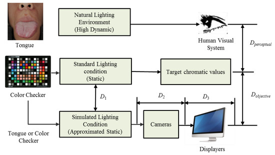 Figure 1. The objective distortion represents a quantitative difference between the captured image and the target chrominance value. Perceptual distortion reflects the difference between the human perceived tongue images from the patients and the monitors. As shown in