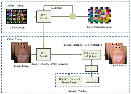 Figure 2. It can be divided into offline training and online testing stages. During the offline training stage, a simple convolutional neural network is designed and trained using a color checker. During the online testing stage, the well trained convolutional neural network is utilized to objectively correct the captured tongue images to a standard lighting condition. The output images of the first phase will be stored in a database for further automatic analysis. Then, the second phase provides a flexible way to adjust the color appearance of the tongue image displayed on the screen through three parameters. We will also save these parameters to convert the saved objectively corrected tongue images into a perceptual adjusted image. We also defined a set of default parameters for several typical lighting conditions.