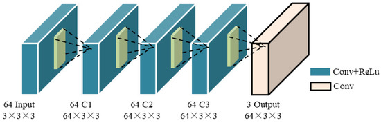 . Except for the output layer, the feature map of each layer is 64 channels. All feature maps have the same spatial resolution as the input image.