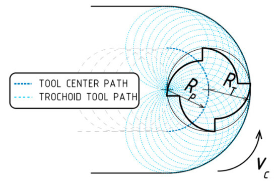 The essential knowledge, especially on theoretical issues of trochoidal machining, was already applied in the last century. The technical term “trochoidal milling” is now commonly used conventionally, despite certain deviations of the real movement of the milling cutting tool compared to mathematically predicted trochoidal trajectories [23] manifesting themselves mainly as smaller spaces at the beginning of the cut and more significant gaps at the end of the cut (Figure 2).