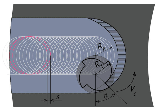 Graphic presentation of trochoidal parameters: s—step of trochoid; RP—radius of the trochoid circle; RT—radius of the milling cutting tool; α—engagement angle.