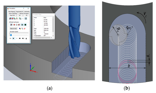 Diagram of the presented method of trochoidal grooving according to SolidCAM: (a) presentation of GUI of SolidCAM; (b) orthogonal view of trochoidal milling path, where: RT—radius of the milling cutting tool; RP—radius of the trochoid circle; b—width of the milled groove; s—trochoid step.
