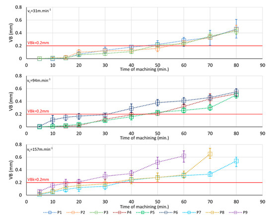 The critical wear limit (VBk – critical flank wear on the cutting tool) was determined with respect to tool geometry at VBk = 0.2 mm (evaluated critical flank wear on the cutting tool). Table 5 gives an overview of the machining times achieved when the critical wear value was exceeded, and the productivity was evaluated by the total material remove parameter during such times (as total material removed).