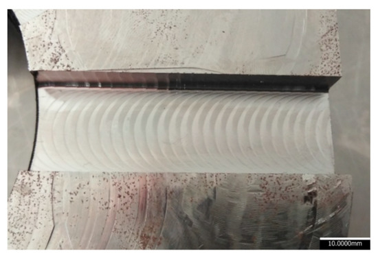 Figure 8. An example of a finished groove sample: the detail of one of the milled grooves with a noticeably higher surface waviness. - Trochoid radius Rp = 5 mm (the same for all experiments);