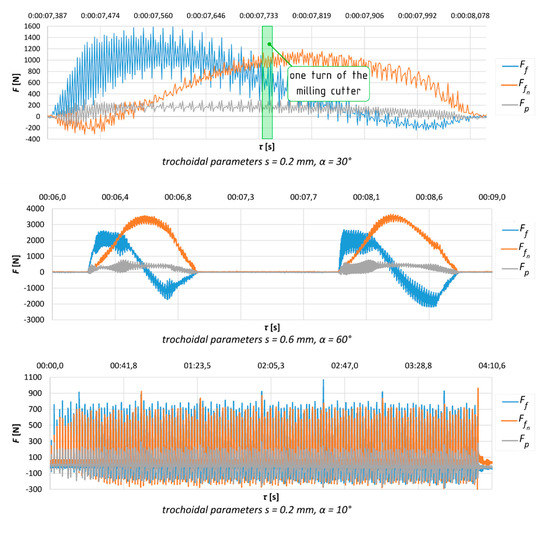 According to the 3-level plan (Table 6), nine grooves were milled on a sample of the same material, when changing the step and the engagement angle. The dynamometer was placed underneath the workpiece, and the cutting forces were measured in the XYZ system, with the milling cutter performing a motion related to the mathematical definition of trochoid, as shown in Figure 3 and Figure 5. The orientation of the tool relative to the reference system changed depending on the movement, which resulted in a change in the size of the cutting force components (projected into individual axes). At the same time, in the second part of the semicircle, the milling cutter was out of the engagement, which resulted in a “zero” load in the course of the components of the total cutting force. Based on the calculated path, the tool came into the engagement, which resulted in a change in the cutting force Ff (in the x axis’s direction). As the tool moved along the trochoid radius Rp, the force increased. As the tool shifted more in the y axis, the force component Ffn grew and the component Ff tended to decrease. The size of the component Fp reflected the entire toolpath in engagement. Research of cutting force, or of cutting force components realized by several experts [11,20,23,34,35,36] in the previous period, was focused mainly on the determination of the impact of tool movement on its load; the creation of mechanistic models; and, last but not least, identification of other impacts, such as machining vibrations. The detected dependencies make it possible to get an accurate idea of the current tool load. These factors were also taken into account when setting the dynamometer sensing frequency to identify the rotation of the tool and the influence of the load on the individual cutting edges of the tool in contact with the material (in engagement—in our case four teeth to four flutes) clearly. Since our research was focused on analysing the impacts of trochoid parameters on the overall tool load, the analysis was not performed using a chatter model, but through local toolmaking peaks for the individual tool passes and average values for these peaks. The data obtained from the development of the total cutting force components, as shown in Figure 9, served as the basis.