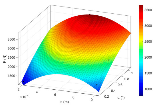 - The results of nine experiments performed for combinations of three different trochoid step settings and three different settings of the engagement angle at constant trochoid radius were processed statistically, and the predictive equation of the total machining force and the corresponding response area of the total machining force were created.