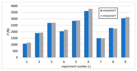 In Table 9 is the comparison of values from measurements (total machining force Fmax was computed from indirect measurements of cutting forces) with predicted values—computed values of Fmax.