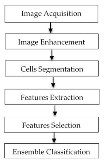 The system flow diagram of the proposed computer-assisted screening of cervical cytology is presented in Figure 2. Our proposed system involved six stages—Image acquisition, image enhancement, cell segmentation, features extraction, features selection, and classification []. At the image acquisition step, the SIPaKMeD dataset was used for multi-cells, and the Herlev dataset was used for a single cell. Input Pap smear images were enhanced and denoised to improve the image quality as an image enhancement step. The next step was cell segmentation. This step partitioned the input images into the interesting regions—nucleus and cytoplasm. After segmentation, the next step was feature extraction. In feature extraction, distinctive interested points or features were extracted. In the features selection stage, the random forest algorithm was used as a selection method. The final step was the classification. In this stage, the cells were classified using bagging ensemble classifiers into normal or abnormal cells. The details of each step have been explained in each sub-sections.