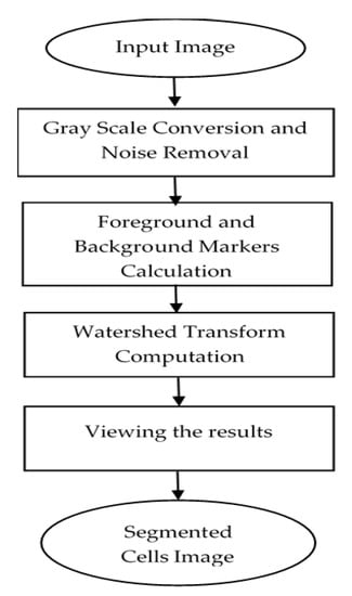 The aim of this step was to segment the regions of the cell from input images. The nuclei and cytoplasm are important components in the cell region. In a Pap smear screening system, cytologists examine the microscope images of cells and label the cells into cancer or normal cells based on the appearance of cells components. The automated screening system is also the same procedure. The segmentation of cell components is an important step in the automated detection system. There are many difficulties in the multi-cells segmentation process, such as overlapping cells or including unwanted artifacts. The nuclei segmentation is easier than cytoplasm segmentation. In our multi-cells image, nuclei were low intensity, and the shapes were well structured, mostly oval or round shape, and significantly different from the other regions, background, or cytoplasm. But the major issues in cytoplasm segmentation are overlapping boundary and poor contrast. Most studies have focused on nuclei segmentation, and rarely studies have focused on cytoplasm segmentation. In Pap smear analysis, the characteristics of cytoplasm are very important. We used the marker-controlled watershed algorithm for cytoplasm segmentation to solve the issue of overlapping boundary detection and splitting of touching cells into individual cells. The main problem of the standard watershed transform is over-segmentation. To avoid this problem, we used markers. The marker image was a binary image with one marker point or multiple points. The flowchart of the proposed modified watershed transform algorithm is described in Figure 6.