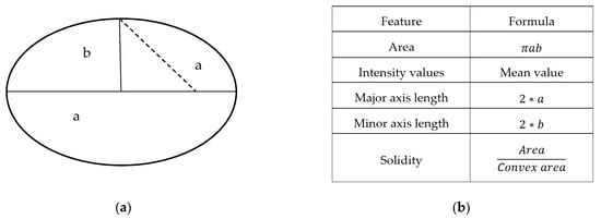 (a) Sample diagram of calculation formula for extracted features. (b) Shape-based features and their equations.