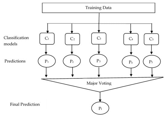 In this stage, we used a bagging ensemble classifier. Ensemble learning can help to improve the prediction results by combining several models. Bagging uses bootstrap sampling to obtain the data subsets for training the base learners. For combining the outputs of base learners, bagging uses voting for classification. Combining stable learners was less advantageous since the ensemble would not help improve generalization performance. In our proposed classifier, five classifiers were trained, and the results of the predictions of each classifier were combined. The result was decided based on majority voting. The block diagram of the combined five classifiers is shown in Figure 13.
