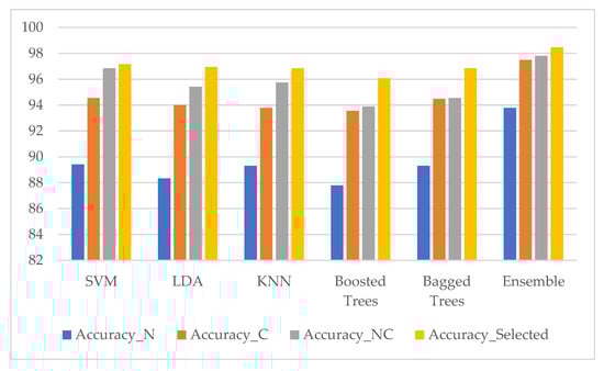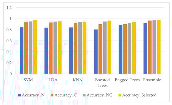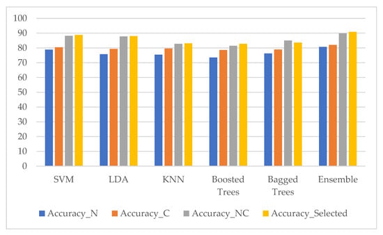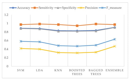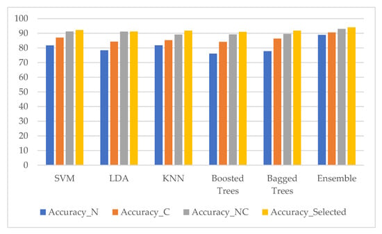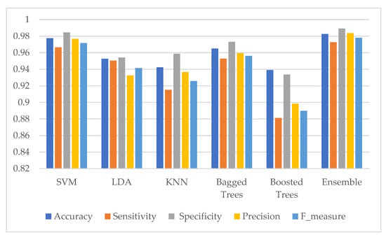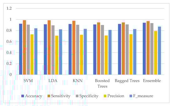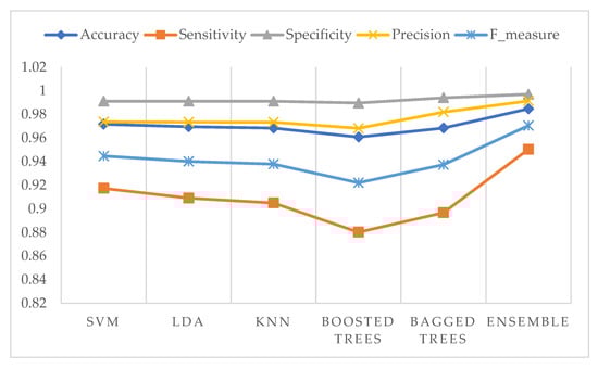 Moreover, the five performance measures of each classifier using selected features are shown in Figure 16 for the two-class problem and Figure 17 for the five-class problem.