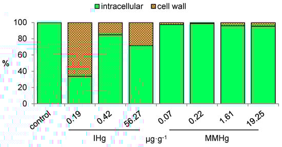 Because toxicity is hypothesized to originate from the intracellular uptake, we further investigated the subcellular fate of Hg in E. nuttallii. In plants, vacuoles and cell walls have a recognized role for Hg sequestration and are expected to protect the cellular components [27,28]. In shoots of E. nuttallii exposed for 24 h to 3.5·10−10 M IHg and 1·10−10 M MMHg in the presence of 1 mg·L−1 DOC, close to 68% and 73% of THg was internalized, likely in the vacuole, and around 32% and 26% was found in cell walls, respectively [19,21]. However, in these experimental conditions 99.9% of Hg was expected to be bound to DOM. On the contrary, in E. nuttallii exposed to 1·10−11 M IHg and MMHg without DOM, 33% of Hg was intracellular for the IHg treatment, while close to 100% of Hg was intracellular for the MMHg treatment [25] (Figure 1). Data revealed earlier that IHg and MMHg affinities to DOM and ions are contrasted [5,9,10]. In the same line, the distinct affinities of IHg and MMHg to cell walls could explain the higher EF of MMHg than IHg in primary producers. Besides, intracellular Hg is expected to be highly available to predators, and could thus result in the higher transfer and biomagnification of MMHg in natural waters [9].