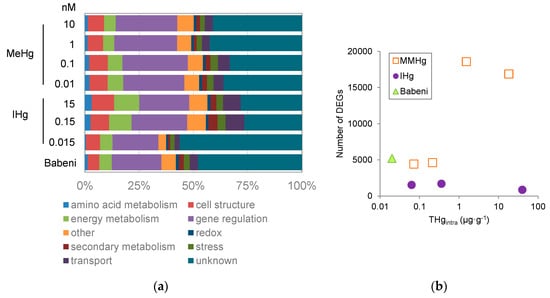 (a) proportion of regulated genes among gene ontology terms (Mapman terminology) and (b) number of deregulated genes (DEGs) as a function of THg bioaccumulated in the intracellularly in E. nuttallii exposed for 2 h with IHg, MMHg in the laboratory or in the Babeni Reservoir (Romania) [10,25].