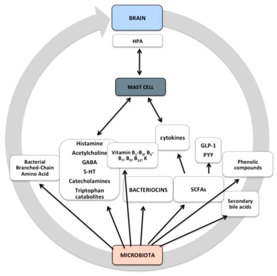 Microbiota-derived molecules. Microbiota-derived molecules are produced as intermediates or end products of microbial metabolism. These molecules can be derived directly from bacteria or from modification of other molecules, such as bile acids, and they influence fundamental biological functions. Some microbial products may pass through the blood–brain barrier (BBB), thereby affecting it. The microbiota and its metabolites can control events both in the peripheral and the central nervous system (CNS) through nerve activation, cytokine production, neurotransmitters, and short-chain fatty acid (SCFA) release, as well as via systemic circulation. Some signals may activate mast cells that are both sensors and effectors of cytokines and neuropeptides/neurotransmitters, affecting hypothalamic–pituitary–adrenal (HPA) activity. The exact mechanism remains unknown. GABA, gamma-aminobutyric acid; 5-HT, 5-hydroxytryptamine.