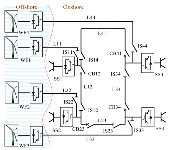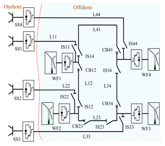 SSRT is similar to a WFRT with a ring on GS-VSCs. Each WF-VSC is integrated with a corresponding mainland power converter station as shown in Figure 4 [28]. The difference between WFRT and SSRT is that GS-VSC is isolated in WFRT while WF-VSC in SSRT, from which a dc fault persists in a dc-link. This configuration offers more flexibility under both faulty and maintenance operations on the mainland ac grid than the wind farm side [30]. The third condition of GBSQSS is not satisfied as, during dc fault in SS ring, an onshore SS and an offshore WF are disconnected (dc breaker operation on either side of the fault), which leads to maximum power loss.