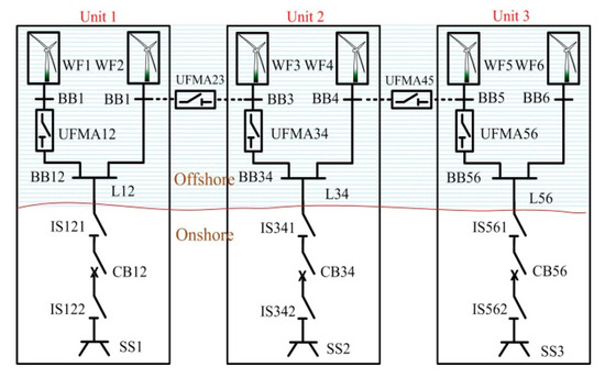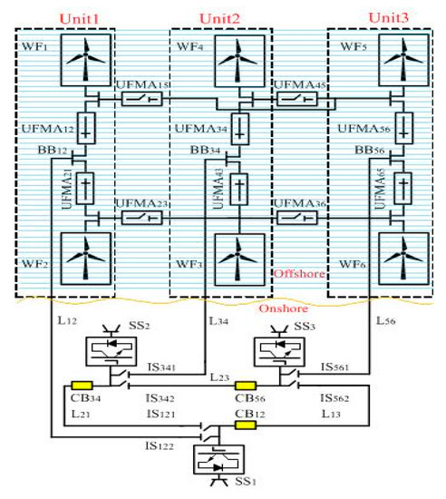 The 2WF-1SST is comprised of two WF side VSCs linked to a GS side VSC via a dc-link such that each WF-VSC is connected with the adjacent unit’s WF-VSC through UFMA as depicted in Figure 5 [25]. The application of the MT-HVdc system decides the number of such units. It exhibits better stability, flexibility, and efficiency with the reduced number of DCCBs, but operation of 2WF-1SST will be greatly affected if the fault persists on end sectioned lines (i.e., L12 and L56) or permanent fault persist within sectioned GS-VSCs (SS1 or SS3). Thus, a new better variant is needed.