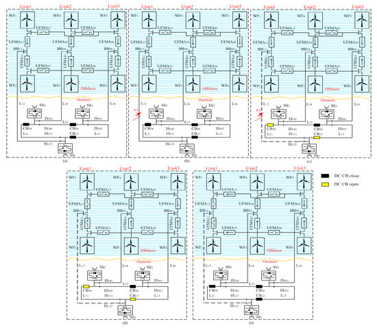 Figure 7. 2WF-SSRT topology operation in the event of a fault on the line L12: (a) at t0, 2WF-1SST topology during normal operation, (b) at t1, fault appears on the line L12, (c) at t2, CB12 and CB34 operates, (d) at t3, IS122, UFMA12, and UFMA21 open (e) at t4, first UFMA15 and UFMA23 are closed and then CB12 and CB34 re-closed as well. - (2)