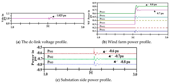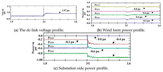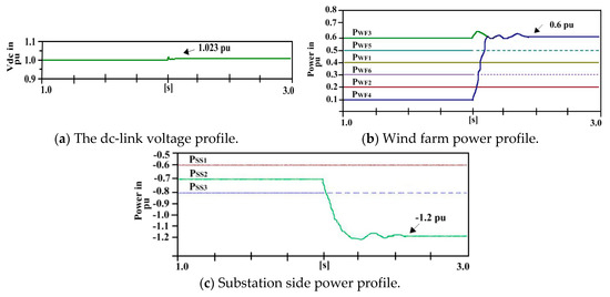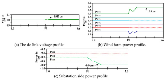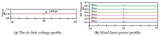First trial associates with the disconnection of the grid side converter. The dc voltage and power profiles of WFRT are shown in Figure 9. GS-VSC1 power dropped to zero from −0.6 pu because of the immediate disconnection as this VSC station experienced a symmetric fault on the ac side, causing excessive power in the dc grid. Promptly, dc-link voltage builds up to 1.25 pu while, at t = 2.1 s, Vdc drops to 1.07 pu as droop control increases power transfer through GS-VSC2, GS-VSC3, and GS-VSC4, supplied by the WF-VSCs. Wind power extraction stays unchanged. The permissible range of ±10% is violated for dc-link voltage. WFRT does not devise any protection to tackle with such circumstances, which is a drawback.