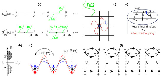 Theoretical setup (a) Floquet expansion of the Green’s function G into higher harmonics of . (b) Hubbard model of the electronic system. The gap between bands is defined by the Coulomb interaction U symmetrically to the Fermi Energy . (c) Tight binding system of the crystal lattice. The hopping parameter t is renormalized by external time dependent excitations . are renormalizations of the local potential alone; (d) non-equilibrium DMFT. Pump photons enhance electronic hopping which is mapped on the single site on the background of the surrounding identical lattice sites, the bath. (e) integration over all sites yields an effective self-consistent theory including non-equilibrium effects. The electronic system is coupled to Mie resonances; (f) diagrammatic contributions of the second order IPT.