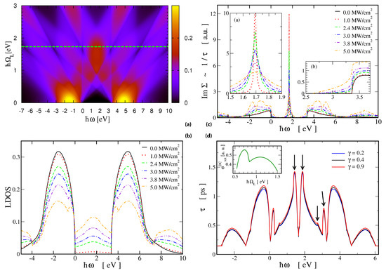 The Hamiltonian for the correlated system, , Equation (1), is solved numerically with a single-site Dynamical Mean Field Theory (DMFT) [33,34,35] and an iterated perturbation theory solver (IPT), see Figure 2f. The laser-band-electron Green’s function , Equation (4), is characterized by the wave vector k, describing the periodicity of the lattice, the electronic energy and the external driving frequency as contained in the Floquet indices . The DMFT self-consistency relation assumes the form of a dimensional matrix equation in regular Keldysh space and in becomes dimensional in Floquet space. The IPT is generalized to Keldysh-Floquet form as well. The resulting numerical algorithm proves to be efficient and stable for all values of U.