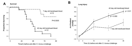 Kaplan–Meier survival curves and lung injury plots for canines receiving longer stored vs. fresher red blood cells (RBCs). (A) Proportion of animals surviving over the study period of 96 h comparing canines inoculated with S. aureus intrabronchially and subsequently exchange transfused with RBCs stored for 42 days (solid circle, solid line) or RBCs stored for 7 days (open circle, dashed line) RBCs. (B) Serial makers of lung injury. Arterial-alveolar oxygen gradient increase demonstrates worsening lung injury in the canines with S. aureus pneumonia that received longer stored 42-day-old (solid circle, solid line) vs. fresh 7-day-old (open circle, dashed line) RBCs at 24 h (p = 0.005) and 48 h (p = 0.01) after bacterial inoculation. From: Solomon, S.B.; Wang, D.; Sun, J.; Kanias, T.; Feng, J.; Helms, C.C.; Solomon, M.A.; Alimchandani, M.; Quezado, M.; Gladwin, M.T., et al. Mortality increases after massive exchange transfusion with older stored blood in canines with experimental pneumonia. Blood 2013, 121, 1663-1672, doi:10.1182/blood-2012-10-462945.