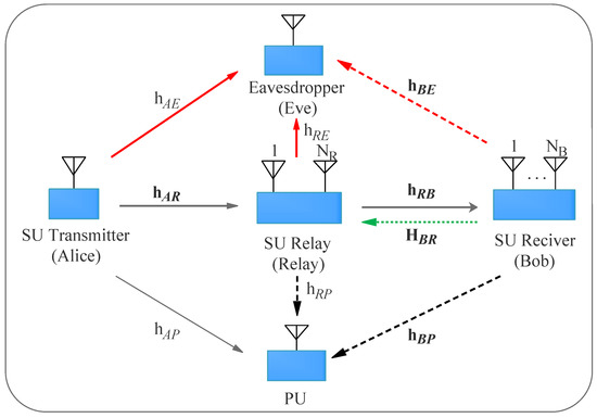 Due to the open nature of CRNs, they are vulnerable to illegal attacking and malicious eavesdropping, which would result in many challenging issues, especially security. Traditional security policies are not applicable to meet the security requirements of CRNs. Motivated by the problem, physical layer security (PLS) has been conceived as a new paradigm to guarantee secure transmissions while overcoming the vulnerabilities of traditional higher layer cryptography. For enhancing the PLS of wireless transmissions, many works have been explored. The orthogonal frequency-division multiplexing of CRNs as the medium access technique is put forward to show the performance of PLS in [6]. In [7,8], the authors proposed multiuser scheduling-aided energy harvesting to improve PLS in CRNs. The maximizing secrecy capacity of CRNs through zero forcing beamforming (ZFB) was investigated in [9]. There is still a lot of previous work that has been done on PLS of CRNs. In [10], the security strategy deployment for switches on core network is proposed to enhance network’s performance in cognitive internet of vehicles. In [3,11,12], the authors proposed different protocols to enhance the secrecy performance of CRNs. The device-to-device (D2D), the non-orthogonal multiple access (NOMA), buffer-aided technology and millimeter-wave (mmWave) were also used to improve the communication quality of CRNs [13,14,15,16,17].