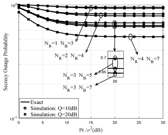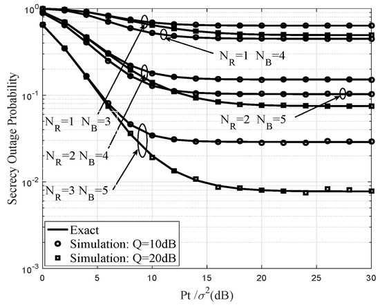 Figure 2 and Figure 3 illustrate the impact for different numbers of , , and Q on the SOPs of the MRC/MRT-SC and MRC-ZFB/MRT-SC-ZFB schemes, respectively. at different . The exact curves are obtained from and . Due to the strong eavesdropping ability of the eavesdropper, the MRC/MRT-SC scheme does not significantly change the system performance. It is clearly seen that the outage performance of wireless communications is proportional to the number of , and . Obviously, if the is higher, the outage performance of the system will be better. As shown, MRC-ZFB/MRT-SC-ZFB scheme achieves the best performance over the range of and the secrecy rate of the MRC-ZFB/MRT-SC-ZFB scheme gradually increases with before it saturates. And in this section, secrecy outage floor will appear in MRC-ZFB/MRT-SC-ZFB and MRC/MRT-SC schemes when increases, this is because the Q is a crucial factor influencing the secrecy performance of system and is not limited by the of the secondary user transmitter. Additionally, when the number of and Q are fixed in two schemes, MRC-ZFB/MRT-SC-ZFB scheme with FD operation and beamforming with AN obviously attain better performance than MRC/MRT-SC scheme with HD operation from the perspective of enhancing the secrecy performance of wireless communications.