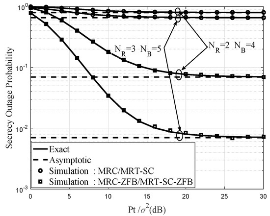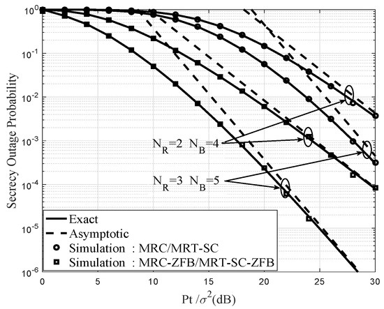 Figure 5 shows the SOP versus of the two schemes when dB, , and . The asymptotic expressions curves of SOP are achieved from (53) and (56) under the and , respectively. The analytical results shows that the MRC-ZFB/MRT-SC-ZFB scheme has better performance than MRC/MRT-SC scheme under different and . It is noted that, for fixed , increasing and lead to a slight decrease in the values of SOP. Additionally, the MRC-ZFB/MRT-SC-ZFB scheme achieves better performance than the MRC/MRT-SC scheme at the low , while the same holds at the high . Therefore, the MRC-ZFB/MRT-SC-ZFB scheme improves the transmission performance of wireless communication under Scenario II.