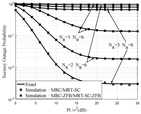 Figure 6 shows the SOP of two schemes for different number of and fixed varies with dB and dB. As the Relay is equipped with more antennas, the SOP steadily decreases. It can be seen that the MRC-ZFB/MRT-SC-ZFB scheme always outperforms the MRC/MRT-SC scheme, and MRC/MRT-SC with HD operation scheme has a higher SOP under the same conditions. In particular, the MRC-ZFB/MRT-SC-ZFB scheme has a greater influence on the secrecy performance of the system than the MRC/MRT-SC scheme from the perspective of the value of . The reason is that the MRC-ZFB/MRT-SC-ZFB scheme enhances system secrecy performance based on FD operation at Bob. Thus, it also verifies the exact validity and the rationality of the closed-form expression of our proposed schemes. It is found that the more , the better the system performance, and the secrecy performance of the proposed MRC-ZFB/MRT-SC-ZFB scheme with FD operation is mainly affected by the secrecy coding gain.