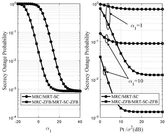 Figure 7 shows the secrecy outage probability vs , and . dB, dB, and are set in two figures. In the first figure, when we set SNR = 20 dB, the simulation results demonstrate that when is relative low, the SOP of two different schemes decreases when increases. The MRC-ZFB/MRT-SC-ZFB of our proposed scheme outperforms MRC/MRT-SC scheme. The main reason is that the main channel is similar with the eavesdropper’s channel. However, when is over 20, the eavesdropper’s eavesdropping ability is relative weak and the noise power is almost zero, so there is no eavesdropping and interference object for MRC-ZFB/MRT-SC-ZFB scheme. Therefore, the two schemes have almost the same effect on system performance.The second figure shows that the SOP of two different schemes decreases when increases. When and 10, the SOP of MRC-ZFB/MRT-SC-ZFB scheme have obvious influence than the MRC/MRT-SC scheme in terms of enhancing the secrecy performance of system.
