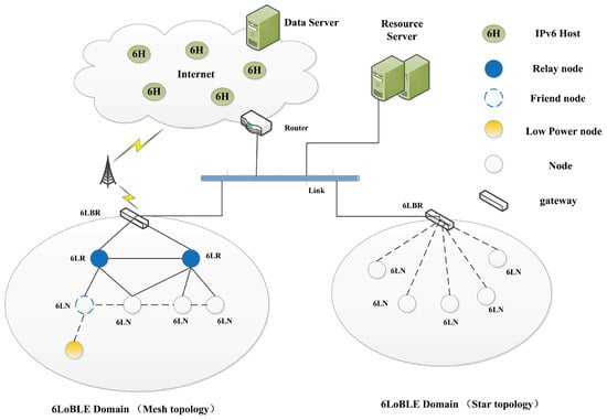 Both the BLE mesh topology and the BLE star topology are considered in the network structure. In a star-topology 6LoBLE domain, central devices will act as 6LoWPAN Border Router (6LBR) and peripheral devices will act as a 6LoWPAN Node (6LN), respectively. Central and peripheral nodes perform BLE functions in the domain. In a mesh-topology 6LoBLE domain, nodes have the same features as the BLE mesh network, and the mesh gateway, relay nodes, friend nodes and nodes will act as 6LBR, 6LoWPAN Router (6LR) and 6LN, respectively. Table 1 shows the detailed mapping methods. A mesh gateway is a node that can translate messages between the mesh network and the IPv6 network.