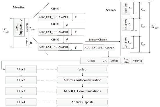 A traditional BLE network turns to the connected communications mode when the neighbor discovery process is performed on channel CHx1. However, to achieve the transmission of the IPv6 packets, the IPv6 address is needed for the nodes in 6LoBLE networks. In 6LoBLEmesh ND, following the connection setup, the new joined node performs the IPv6 address auto-configuration mechanism on channel CHx2. The configuration method will be described in detail in Section 3.2. Based on BLE 5.0, the frequency hopping strategy is used to change channels after each information exchange between nodes. Therefore, CHx3 and CHx4 are used for the 6LoBLE communications and address update as shown in Figure 3.