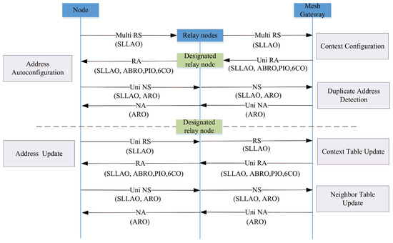 For the security of BLE mesh networks, the node may use its device private address instead of the static address. The private address is suggested to change every 15 min. When the device address changes, the address update mechanism is triggered by the node. The node sends the NS and RS messages to the mesh gateway to register the new IPv6 address. Due to the same connection between the node and the relay node, unicast communications are performed during the address update. The procedure is shown in Figure 4.