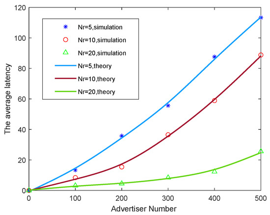 Figure 5 compares the analytical latency results and the simulation results for all nodes joining the network. The analytical results show the close patterns as the simulation results. Figure 5 shows that the number of relay nodes has a certain influence on the discovery delay of nodes in the network. First, up to 500 nodes are deployed in the network domain, using the 6LoBLEmesh neighbor discovery protocol, and the overall average discovery latency can be maintained within 120 s. Next, if the number of relay nodes is sufficient, the discovery latency of the network can be greatly reduced. In particular, if the average number of connectable relay nodes is less than 25, the discovery delay in the network domain can be maintained within 60 s. Generally, an increase in the number of relay nodes that can be connected reduces the discovery latency of nodes in the network domain.