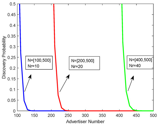 Figure 6 shows the discovery probability for the different number of nodes N and the different number of relay nodes . In Figure 6, when remained at 10:1, we can see that the discovery probability is close to 1. However, as the ratio of the number of nodes to the number of relay nodes increases, the discovery probability drops rapidly. When N increases from 100 to 500, the discovery probability drops to the lowest at the ratio of 15:1. For the case that N increases from 400 to 500, the discovery probability drops more sharply than the less crowded situation. When the ratio reaches to 11:1, the discovery probability declines to its lowest value.