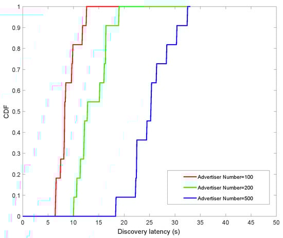 Figure 7 shows the Cumulative Density Function (CDF) of the discovery latency for different numbers of advertiser nodes. It can be seen that for fewer advertiser nodes, the discovery latency does not vary much between the best and worst cases. While even for 500 advertiser nodes, the proposed neighbor discovery process could promise the latency less than 35 s with a high probability.