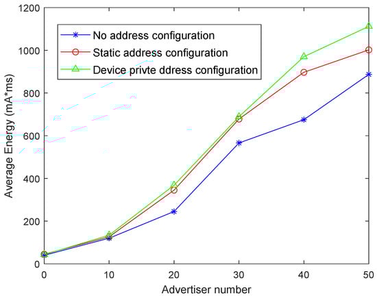 To test the impact of the IPv6 address configuration mechanism on energy consumption, in the simulation, we set the number of relay nodes to 10, and also conducted neighbor discovery simulation for 50 advertiser nodes deployed in the network domain. The average energy consumption of a single node is tested under three conditions: no address configuration mechanism, static address configuration, and devices’ private address configuration for nodes. The results are shown in Figure 8. Since the standard neighbor discovery process of BLE 4.2 does not perform address configuration mechanism, here we use the standard protocol to perform the situation without address configuration mechanism. Furthermore, the address configuration mechanism with static address and devices’ private address are simulated to compare with each other.