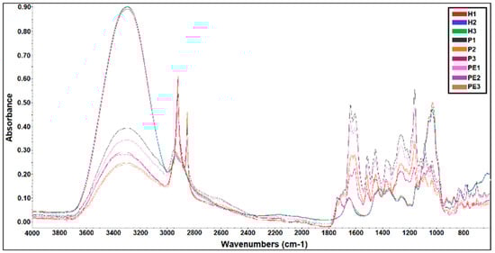 3.1. FTIR Analysis of the Samples of Honey, Propolis, and Propolis Extracts