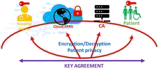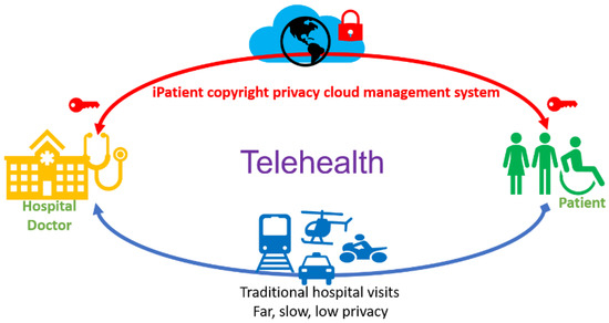 Additionally, telehealth has received considerably increased attention. In this medical treatment approach, all the medical prescriptions, personal privacy, medical record copyright, etc., are transmitted on the public network and the data are stored in the cloud system. The main topics in this paper include the following: How to ensure telehealth visits occur in a secure transmission environment, how to securely transfer data and securely process data, and how to ensure that all actions related to patient privacy are performed with the patient’s full authorization. The management of general medical records is mainly through a secure tunnel to encrypt and decrypt data. The tunnel is constructed by a cryptographic asymmetric public key system or symmetric key agreement. Asymmetric public-key encryption and decryption methods need to maintain huge public and private key pairing creation and storage costs. Accordingly, in recent years, symmetric encryption and decryption by a session key agreement mechanism has managed privacy issues. The main point of the key agreement mechanism is to design a set of zero-knowledge-based communications. The two communication parties cannot transmit information that is derived or reversibly decrypted to obtain the private key, and also cannot reveal personal identities during the medical communication process. This paper proposes, under the above premises, an application to provide medical personal privacy and a copyright access mechanism that is managed in the cloud, where the entire process is conducted in a patient-controlled authorization environment, which can be seen in Figure 1. The paper is laid out as follows. Section 2 introduces the related work. Our protocols are found in Section 3. Security analysis is shown in Section 4. Section 5 shows performance comparisons. Section 6 illustrates the conclusions.