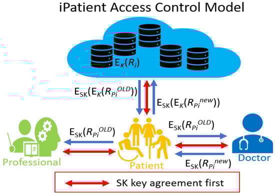 This phase involves the stages of health medical privacy creation, sharing, and storage. In our iPatient access control model, doctors or clinics have read and updated permissions, while authorized professionals have only read permissions. Only patients themselves can access the encrypted personal privacy of the cloud server. Additionally, all data stored in the cloud are also protected by the patient’s private key. All decrypted data must be transmitted in a secure tunnel established through a key agreement. Below, we show six strategies in the iPatient access control model and show the strategy diagram in Figure 3.