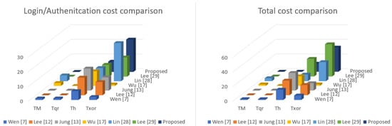 In Figure 4 and Table 2, we mainly focus on the lightweight operation, which mainly includes XOR and hash operations. Though our proposed mechanism is not the best in XOR operation performance, our hash function operation performance is the best. In the case of total cost, the operation computation time of bitwise XOR has less hash function, so our proposed mechanism uses the least cost and has better performance. As mentioned in Table 2, our login phase computation time is (6Th + 1TH + 22Txor) ≈ (7Th + 22Txor) and the total computation time required for our proposed mechanism is (9Th + 2TH + 33Txor) ≈ (11Th + 33Txor) relative time.